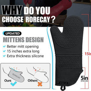 • Compared to the cotton oven mitts, our silicone oven mitts is easy to clean after using, When you’re finished, rinse the oven mitt clean or wipe it down with a damp cloth before hanging it from the convenient loop. The 15-inch extra long oven mitts, trivets and mini pinch mitts are also safe for washing / drying in laundry machine.
