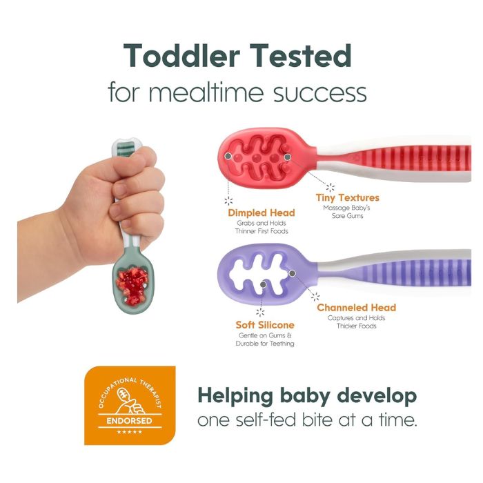 - Make the starting solids transition easier (and more fun!) for the baby. Each set comes with a pre-spoon perfect for purees, doubling as a teether for sore gums, along with an open-channel spoon designed to grip soft solids. These spoons help teach the skills and motions needed to graduate to a traditional spoon, without requiring wrist rotation to use – a skill children typically don’t develop until 2 years old.